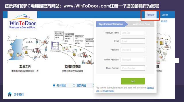 WWW.WinToDoor.Com是全球第一家专门为”中美跨境电商“提供“全程门到门海陆联运服务”的O2O平台,让您“赢上门”(WinToDoor)!从此,”中美跨境电商“就可以”全程无忧“,专注于您的产品销售,将中国更多更好的产品,通过经济实惠的海运方式发运至我们的洛杉矶配送中心,再由我们进行美国本土配送,快速直达到美国消费者手中。